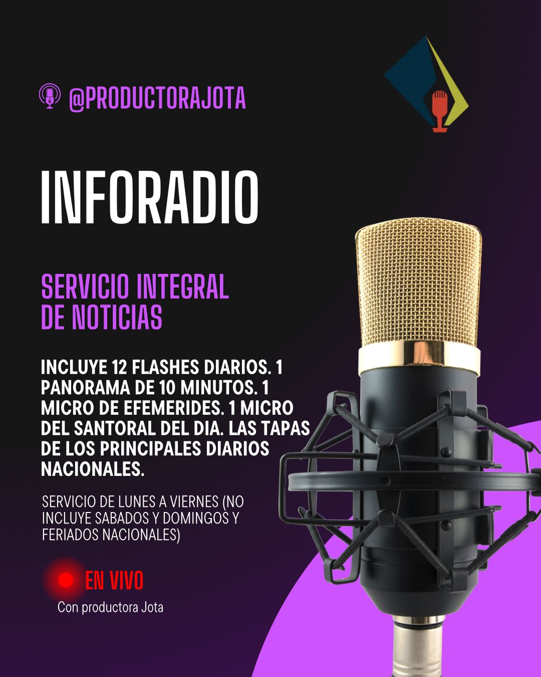 El servicio de noticias incluye: 12 flashes diarios + 1 panorama de 10 minutos + las tapas de los diarios del día para redes + 1 micro de efemérides del día + 1 micro del Santoral del día. El servicio tiene exclusividad zonal en su ciudad.